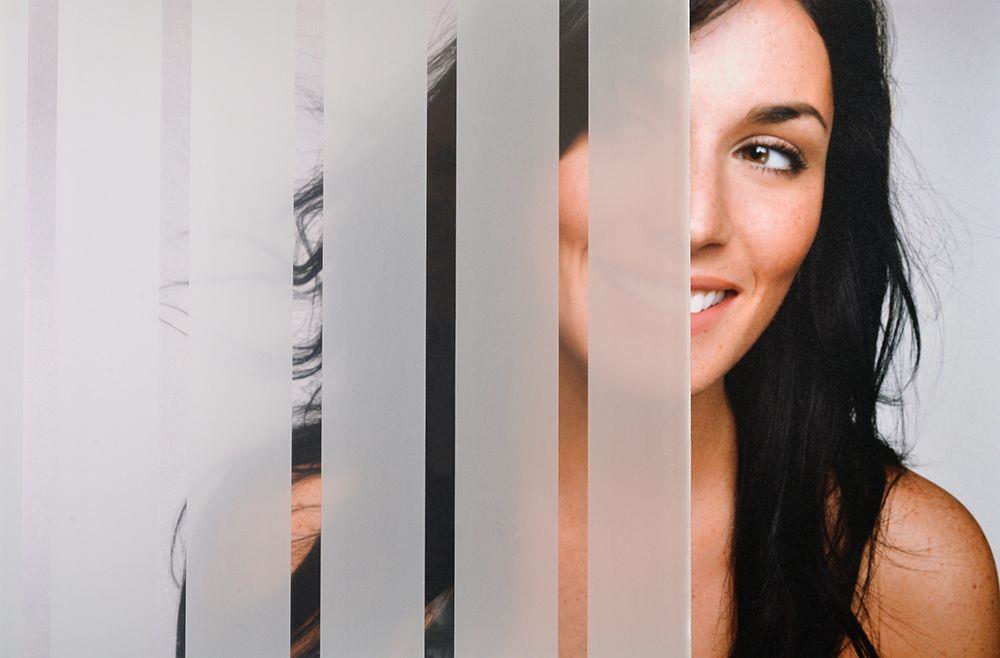 Frosted Stripes 1 3/8″ separated by 3/8″ clear lines. Ideal for obscuring direct visibility and allows excellent light transmission. SR coating.