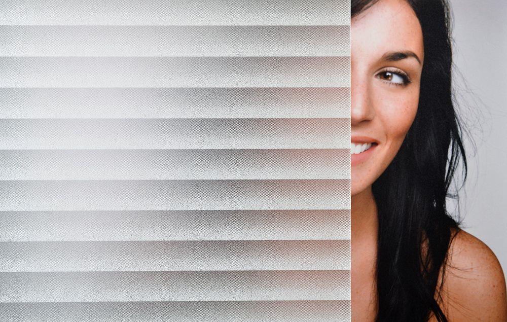 This Decorative Privacy Glass Film is recommended for application to interior glass and exterior glass. This film is a durable vinyl with a decorative embossed matte surface and minim blind pattern. 3⁄4” gradient horizontal stripes. This film has a silicone liner and pressure-sensitive adhesive. It is perfect for privacy, decorative or architectural applications.